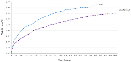 Water absorption comparison of flax/VE and flax/VE/basalt hybrid composites.