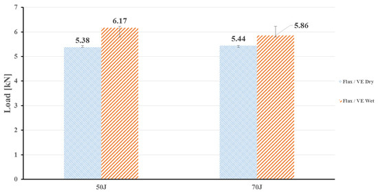 The influence of moisture absorption on the flax composite in dry and wet conditions was investigated. The effects of moisture absorption on the load bearing capability of flax/VE composites impacted at two different incident energy levels are shown in Figure 9. The wet flax/VE specimens displayed a higher peak load compared to wet specimens, slightly outperforming the dry sample. This could be attributed to water absorption-induced plasticisation of the vinyl ester matrix leading to an increase of deformation and impact energy absorption [5,23].
