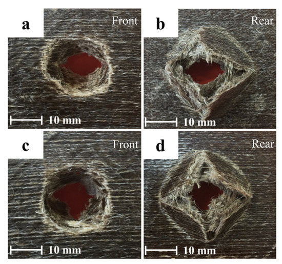 Figure 10 depicts the damage of front and rear faces of impacted flax/VE composite specimens. As can be clearly observed, all the samples impacted at 50, 60, and 70 Joules were fully penetrated. The incident energy of 50 Joules was enough to cause damage to these groups of samples.