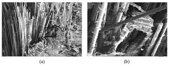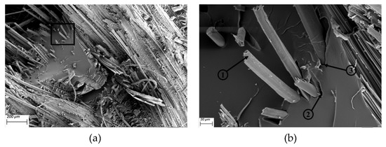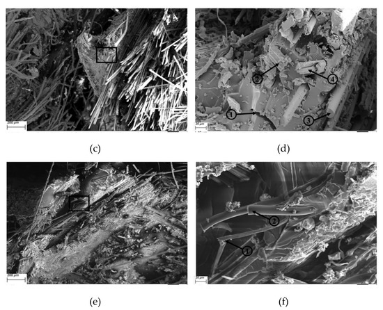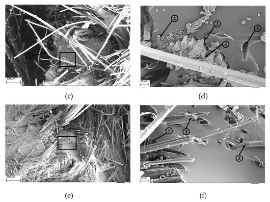From the annotation provided for the SEM images of flax/basalt/VE hybrid composites, as shown in Figure 14a–d, the following can also be observed: