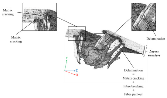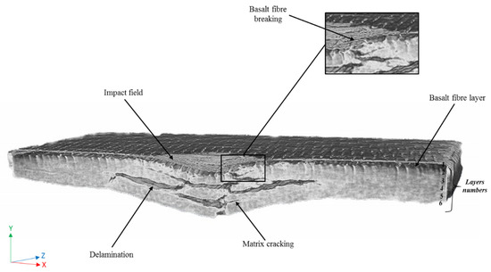 Micro CT scan picture of a flax/basalt hybrid composite specimen (half-view) after an impact test, with a 50 J impact energy, with different failures displayed by the specimen.