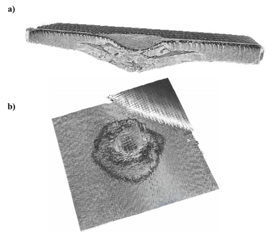 Micro CT scan pictures of a flax/basalt hybrid composite after an impact test, with a 50 J impact energy: (a) half-view of the specimen with impact failure, in the form of delamination, and (b) top view of the damaged area’s shape.