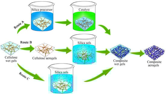Cellulose, as abundant native polymer, has gained recent popularity due to its renewable and environmentally-friendly properties [38,39], including enhanced aerogel strength [27]. Recent studies have combined a cellulose nanofiber network matrix with a silica gel skeleton to produce a nanoscale IPN structure [36,40,41,42,43]. The strength of these silica-cellulose composite aerogels was over two orders of magnitude higher than that of native silica aerogels. There are two main preparation methods for producing these composite aerogels, both of which are notably tedious and time-consuming. The first method involves preparing a cellulose wet gel matrix into which a silica precursor is diffused followed by a catalyst, resulting in a silica gel skeleton (route A in Figure 1) [41,44,45]. This two-step diffusion process is time-consuming, and the silica precursor at the surface of the matrix can separate from the matrix before gelation. The second method involves soaking a dried cellulose web-like nanofiber matrix (i.e., cellulose aerogels) in a prepared silica sol to complete the ongoing sol-gel reaction in the matrix (route B in Figure 1) [33,36,40,42,46]. While diffusion occurs in a single step, the matrix must be dried using freeze-drying or supercritical drying to preserve the web-like structure, both of which are tedious. A simpler process should be developed to save time and improve preparation efficiency.