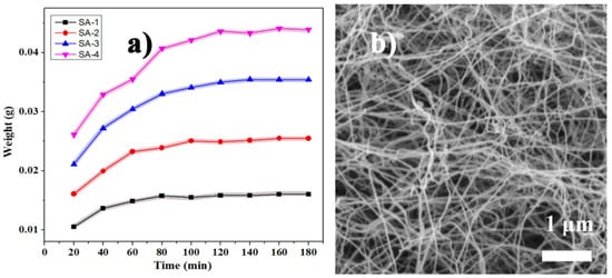 The wet BC gel matrix was immersed in the SA-1, SA-2, SA-3, and SA-4 respectively at low temperature (ice-water bath) for varying amounts of time. The weight of the dried samples first increased rapidly, and then the growth rate became gentle and stabilized within 120 min (Figure 2a). This indicates that without condensation in the alcosols, the silica nanoparticles and precursor could diffuse in the BC matrix effectively; a diffusion balance was reached within 2 h. This efficient diffusion was mainly due to the loose microstructure of the BC matrix. The open spaces between the BC nanofibers were often hundreds of nanometers wide (Figure 2b), much wider than the silica nanoparticles, which were only a few nanometers in diameter. This allowed an easy and rapid diffusion of the silica alcosols to occur in the BC matrix. The pores in the BC matrix are much larger and more uniform than the nanoscale pore size of the cellulose nanofibers networks that were used as the matrix in previous studies [44,45,47]. The BC wet gels offered a superior microstructure to the matrix to promote the diffusion of the silica alcosols and the subsequent gelation in situ. Consequently, a soaking period of 3 h was selected to ensure that the silica nanoparticles and precursor were fully diffused in the BC matrix. Additionally, the content of silica in composite aerogels and the density of these samples gradually increased with increasing precursor concentration (Table 1), indicating that the diffusion of silica alcosols was effective and continued to occur at higher concentrations.
