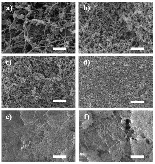 SEM images of (a) CA-1, (b) CA-2, (c) CA-3, (d) CA-4, (e) CA-4/6, and (f) CA-4/3, where the scale bar represents 1 μm.