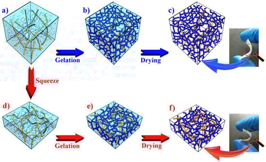 This study aimed to use alcosols directly diffused in wet bacterial cellulose (BC) gel to gradually form an IPN structure in situ, as shown in route C in Figure 1. Firstly, it benefits from the fact that the BC nanofibers in the matrix were more loosely distributed and created gaps between the nanofibers measuring up to hundreds of nanometers. Then, the gelation rate was restricted using low temperature to ensure that the silica alcosols were sufficiently diffused into the wet BC matrix. The soft wet matrix with silica alcosols could be compressed before the rigid and fragile silica gel skeleton formed to increase the content of BC nanofibers per unit volume and regulate the mechanical properties of composite aerogels.