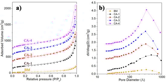 The composite aerogels had a stronger adsorption capacity for nitrogen than the BC matrix (Figure 5a). The nitrogen adsorption-desorption isotherms of the CAs exhibited clear hysteresis loops, a classic characteristic of mesoporous materials [24,51], while this was not observed in the BC matrix. Furthermore, the Barrett–Joyner–Halenda (BJH) pore-size distributions of the CAs indicated a distinctive mesoporous structure, while the BC matrix did not (Figure 5b). The specific surface area of CAs was much higher than that of the BC matrix (Table 1), indicating that a mesoporous gel skeleton was formed in the composite silica-BC aerogels. The increased quantity of BC nanofibers with low (113 m2 g−1) specific surface area in per unit volume showed a slight decrease in the specific surface of CAs, as can be seen for the CA-4/6 and CA-4/3 samples in Table 1. Compared with the silica-cellulose composite aerogels in which only silica nanoparticles were attached to the cellulose nanofiber skeleton, the specific surface area in this work was significantly higher [44]. The width of the peaks in the BJH pore-size distributions became narrower as the concentration of the precursor increased (Figure 5b). Moreover, Figure 5b also shows that with higher concentrations of the precursors that formed the CAs, larger pore volumes in the CAs are obtained (especially mesopores in range 5−50 nm) [52]. Both of these indicated that a higher concentration of precursor resulted in more diffusion of the silica nanoparticles and precursor into the web-like matrix, which aided in the formation of a more uniform porous structure.