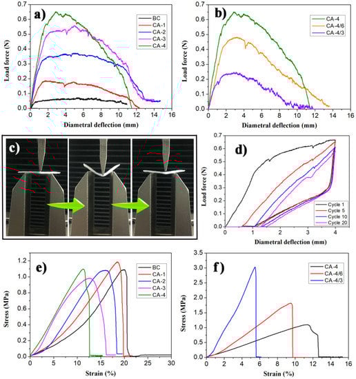 (a,b) Stress-strain curves of three-point bending tests on all the samples; (c) photographs of a three-point bending test on CA-4; (d) stress-strain curves of CA-4 under repeated three-point bending tests; and (e,f) stress-strain curves of tensile tests on all the samples.