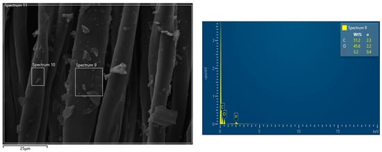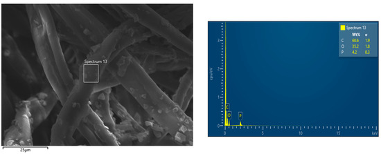SEM-EDX observations have been performed in order to assess the morphology of the cotton fabrics before and after the application of the flame retardant treatment and to assess the presence of the flame retardant. Pure cotton is characterized by a quite smooth texture as evidenced in Figure 2, while the treated cotton fabrics (Figure 3 presents the typical morphology of COT + PA + BC(8) sample) show the appearance of some micro-sized BC particles on the surface. The elemental analysis carried out by energy dispersive X-ray spectroscopy on some areas where BC particles appear (Figure 4) confirms the presence of C, O and P elements (i.e., the main phytic acid and BC constituents, obviously not excluding the C and O contribution from the cellulosic substrate). It is noteworthy that PA, as already observed in sol-gel systems containing this bio-sourced product [27], is likely to coat the fibers with a homogeneous layer; BC micro-sized particles are quite well distributed on the fiber surface.