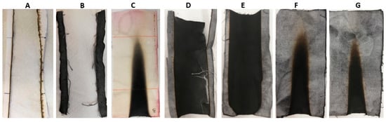 Residues after horizontal flame spread tests. (A) COT, (B) COT+BC, (C) COT+PA, (D) COT+PA+BC(4), (E) COT+PA+BC(6), (F) COT+PA+BC(8), (G) COT+PA+BC(10).