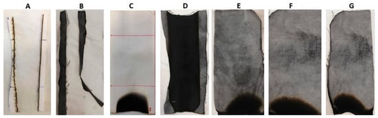 Residues after vertical flame spread tests. (A) COT, (B) COT+BC, (C) COT+PA, (D) COT+PA+BC(4), (E) COT+PA+BC(6), (F) COT+PA+BC(8), (G) COT+PA+BC(10).