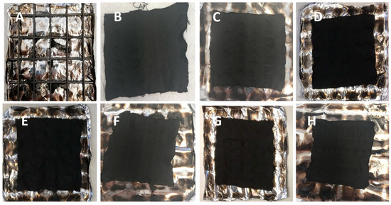 For many application fields, the washing fastness of the flame retarded fabrics is an important issue that can significantly limit their practical use. Therefore, some tests for evaluating the durability were performed according to the AATCC test method 61 (2A)-1996 on selected treated fabrics; then, the fabrics were subjected to horizontal flame spread tests: the obtained data are collected in Table 6, while Figure 10 shows the residues at the end of the tests.