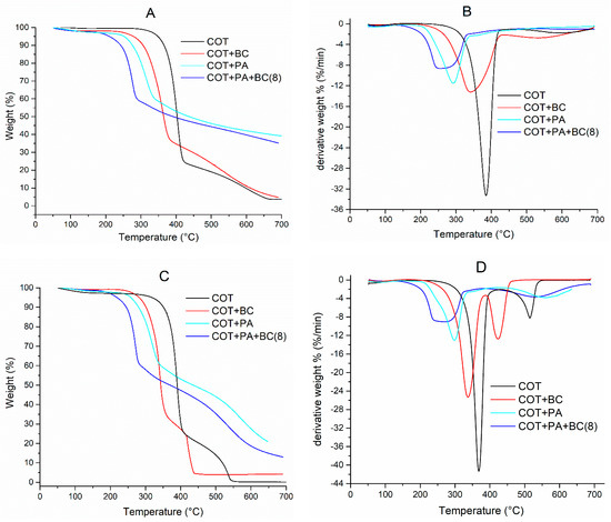 Thermogravimetric (TG) analyses have been utilized for evaluating the thermal and thermo-oxidative stability of untreated cotton and the fabric treated with PA or BC alone, or with the best combination of the two, having the lowest dry add-on that provided self-extinction in flame spread tests (i.e., COT+PA+BC(8)). TONSET, the maximum weight loss temperatures (Tmax1 and Tmax2), the corresponding residues and the final residue at 700 °C are listed in Table 5. Figure 9A–D shows the typical TG and dTG curves.