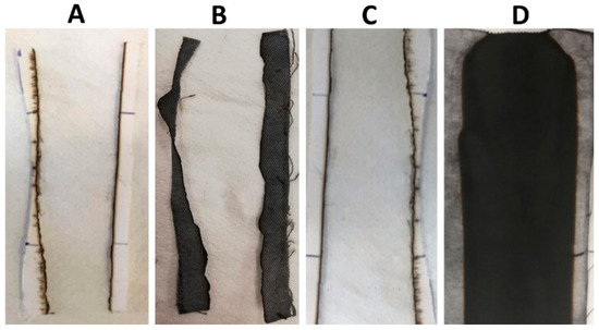 Residues after vertical flame spread tests performed on washed fabrics. (A) COT, (B) COT+PA W, (C) COT+BC W, (D) COT+PA+BC(8) W.
