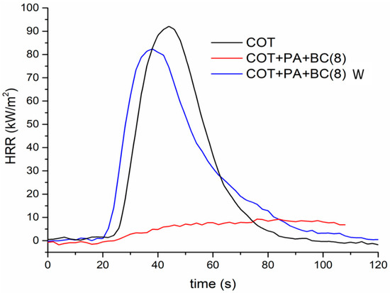 Furthermore, Table 7 compares the forced-combustion data for COT, COT+PA+BC(8) and COT+PA+BC(8)W (i.e., the best performing sample before and after washing cycles, respectively). Figure 11 shows the corresponding HRR vs. time curves. The significant loss of the flame retardant coating as a consequence of the washing cycles allows the sample to ignite at 35 kW/m2 irradiative heat flux; however, the thermal parameters of the washed sample are still better than those of untreated cotton, because of the effect of the FR coating that resisted to the washing process (see EDX analysis, shown in Figure 12, of the residue after horizontal flame spread tests of COT+PA+BC(8) W; the residues after cone calorimetry tests are displayed in Figure 13).