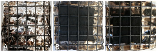 Residues of COT (A), COT+PA+BC(8) (B) and COT+PA+BC(8)W (C) after cone calorimetry tests (heat flux of 35 kW/m2).
