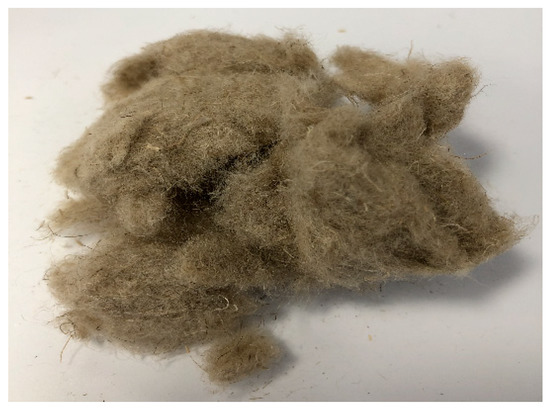 PLA IngeoTM Biopolymer 6201D was obtained from NatureWorks LLC (Minnetonka, MN, USA). It was supplied in pellets, having a melt flow rate (MFR) of 15–30 g/10 min measured at 210 °C and 2.16 kg and a true density of 1.24 g/cm3. This resin is suitable for injection molding and it has been previously screened for preparing green composites due to its high fluidity [19,23,53,54]. Schwarzwälder Textil-Werke Heinrich Kautzmann GmbH (Schenkenzell, Germany) delivered FF as NATURAL FIBRE. The manufacturer supplied the fibers with a length of 6 mm in yarns, having the aspect of a “wool ball”, as a processing by-product of the linen industry. A natural scale view of the as-received short FFs is shown in Figure 1.