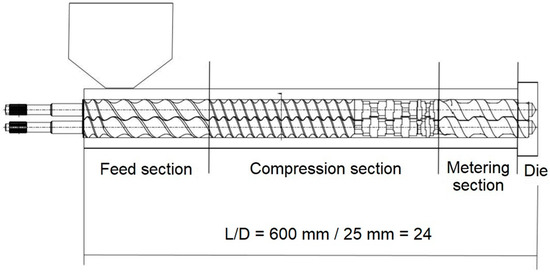 Prior to melt processing, the PLA pellets were dried in a dehumidifier MDEO from Industrial Marsé (Barcelona, Spain) at 60 °C for 24 h to eliminate residual moisture. Then, the PLA pellets and the pretreated FFs were mixed and fed at a constant ratio of 20 wt % into the main hopper of a twin-screw co-rotating extruder from Dupra S.L. (Alicante, Spain). The extruder features two screws of 25 mm diameter (D) with a length-to-diameter ratio (L/D) of 24. The modular barrel is equipped with 4 individual heating zones coupled to a strand die. Figure 2 shows the extruder layout with its different sections and screw configuration. In the feed section, the pellets enter the barrel with the rotating screws. The compression section contains two mixing zones, a conveying section where the pitch reduces in order to shear the molten plastic at the barrel wall followed by a series of kneading blocks (KBs, 8 × 90° R and 5 × 44° L) to enhance filler dispersion. In the metering zone, the channel depth is reduced and the melts moves in a spiraling motion down the screw channels. The melt is finally pumped out of the extruder through an annular die.