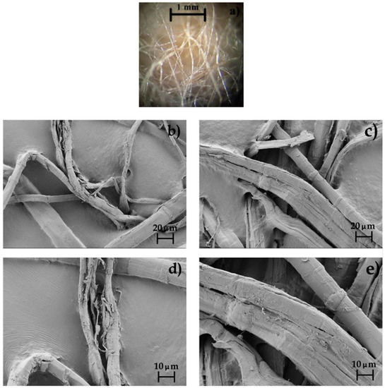 Morphology of the: (a) As-received yarn of flaxseed fibers (FFs) taken by optical microscopy at 12.5× with scale maker of 1 mm; (b) Alkali-pretreated FFs; (c) Alkali-pretreated FFs after silanization taken by field emission scanning electron microscopy (FESEM) at 500× with scale makers of 20 μm; (d) Alkali-pretreated FFs; (e) Alkali-pretreated FFs after silanization taken by FESEM at 1000× with scale makers of 10 μm.