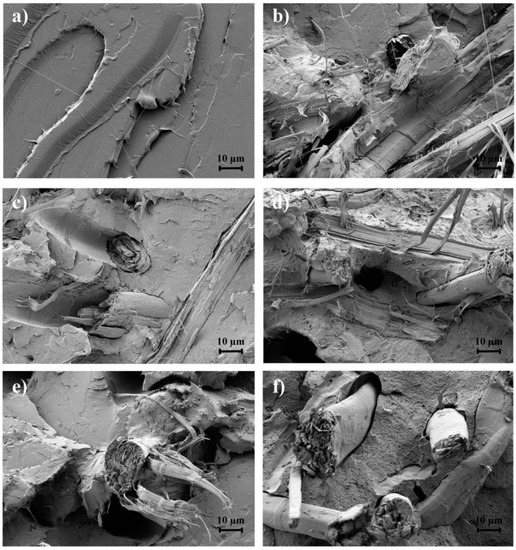 Field emission scanning electron microscopy (FESEM) images of the fracture surfaces of the polylactide (PLA)/flaxseed fiber (FF) pieces of: (a) PLA; (b) PLA/FF; (c) PLA/FF + (3-glycidyloxypropyl) trimethoxysilane (GPTMS); (d) PLA/FF + epoxy-based styrene-acrylic oligomer (ESAO); (e) PLA/FF + poly(styrene-co-glycidyl methacrylate) (PS-co-GMA); (f) PLA/FF + maleinized linseed oil (MLO). Images were taken at 1000× with scale makers of 10 µm.
