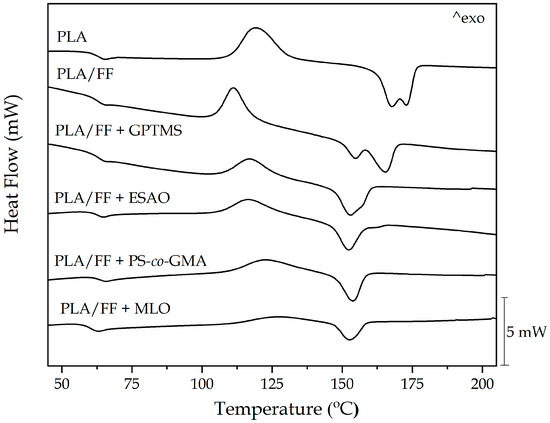 Differential scanning calorimetry (DSC) thermograms corresponding to the polylactide (PLA)/flaxseed fiber (FF) pieces compatibilized with (3-glycidyloxypropyl) trimethoxysilane (GPTMS), epoxy-based styrene-acrylic oligomer (ESAO), poly(styrene-co-glycidyl methacrylate) (PS-co-GMA), and maleinized linseed oil (MLO).