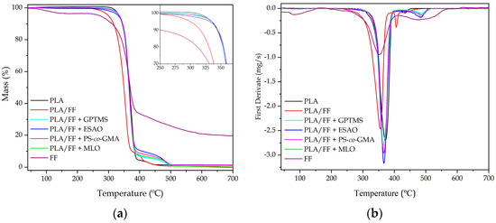 (a) Thermogravimetric analysis (TGA) curves with inset zooming the onset of degradation; and (b) first derivate thermogravimetric (DTG) curves corresponding to the polylactide (PLA)/flaxseed fiber (FF) pieces compatibilized with (3-glycidyloxypropyl) trimethoxysilane (GPTMS), epoxy-based styrene-acrylic oligomer (ESAO), poly(styrene-co-glycidyl methacrylate) (PS-co-GMA), and maleinized linseed oil (MLO).