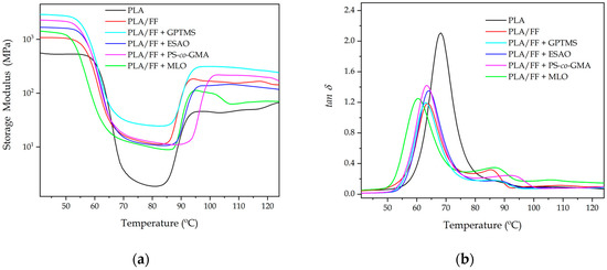 Evolution as a function of temperature of the (a) storage modulus and (b) dynamic damping factor (tan δ) of the polylactide (PLA)/flaxseed fiber (FF) pieces compatibilized with (3-glycidyloxypropyl) trimethoxysilane (GPTMS), epoxy-based styrene-acrylic oligomer (ESAO), poly(styrene-co-glycidyl methacrylate) (PS-co-GMA), and maleinized linseed oil (MLO).
