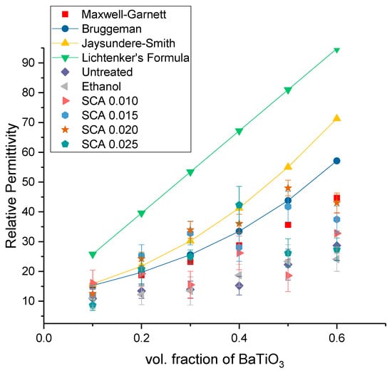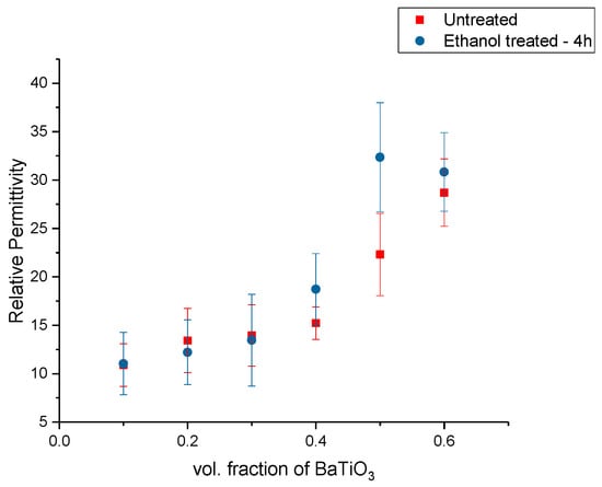 The BaTiO3-epoxy composites were fabricated using BaTiO3 nanoparticles that were surface modified using ethanol for 4 h. The relative permittivity or dielectric constant was measured at 20 MHz and plotted as function of increasing volume fraction of the nanoparticle fillers, as shown in Figure 2. In Figure 2, the relative permittivity is plotted as a function of volume fraction. In this figure, the permittivity increases as a function of volume fraction of the BaTiO3 filler. The ethanol is a dispersant in the composites, where it improves the dispersion of the filler. However, it does not act as a binding or molecular bridge between fillers and polymers [71,72,73,74].