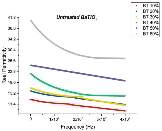 The real permittivity of the BaTiO3-epoxy composite that were fabricated using untreated BaTiO3 nanoparticles is plotted as a function of frequency where the volume fraction of BaTiO3 is varied from 10% to 60%. This value at 20 MHz attains a maximum of 28.70 at 60% volume fraction of BaTiO3.