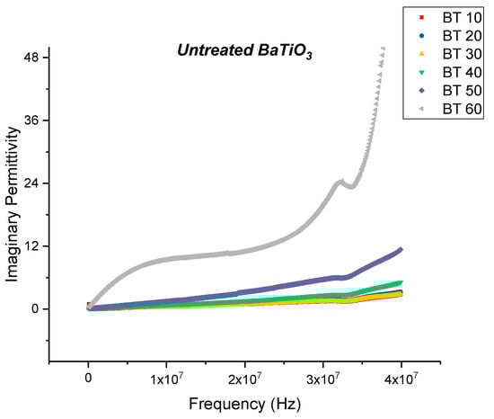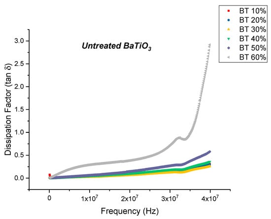 The real permittivity value at 20 MHz attains a maximum value of 28.70 for the untreated BaTiO3/epoxy composite where the volume fraction of BaTiO3 was 60% as shown in Figure 3. The dissipation factor is defined as the ratio of imaginary part of permittivity i.e., dielectric loss with the real part of permittivity i.e., relative permittivity or dielectric constant. Therefore, the dielectric loss can be calculated my multiplying the dissipation factor and the relative permittivity. The maximum dissipation factor at 20 MHz was recorded to be 0.3836 at a volume fraction of 60% of BaTiO which is comparable to that reported by Dalle Vacche et al. (~0.4) [51]. It is important to note that the dissipation factor increases quite significantly at 60% of BaTiO3, as can be seen in Figure 5 and this could be attributed to the increase in agglomerations due to lack of wettability of the powders, and hence causing inhomogeneous dispersion of particles. This creates more air voids within the sample, increasing its porosity and making it difficult to pole, as the air voids are prone to increase in electric conduction.