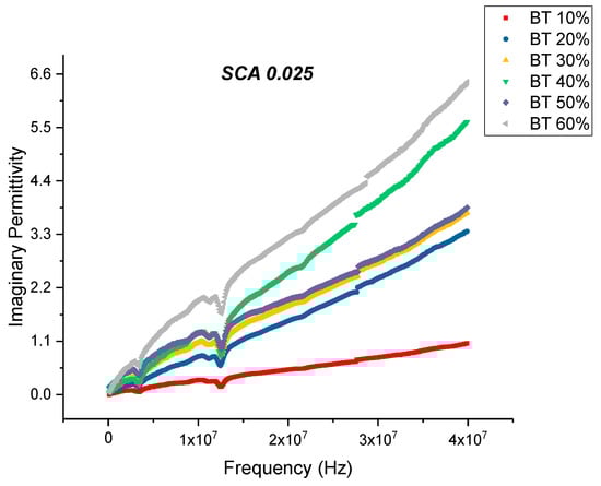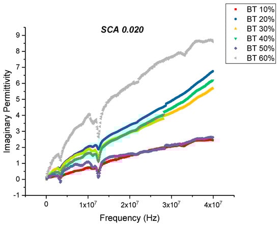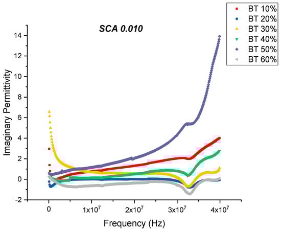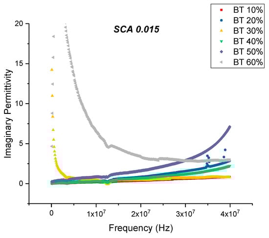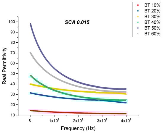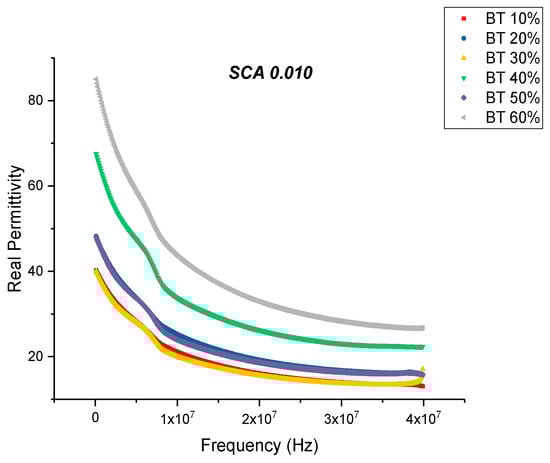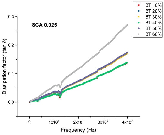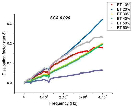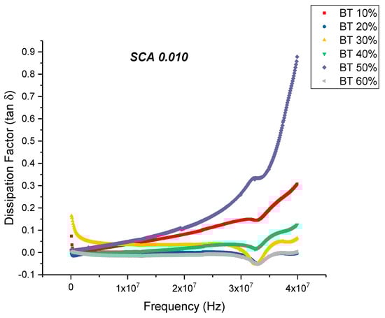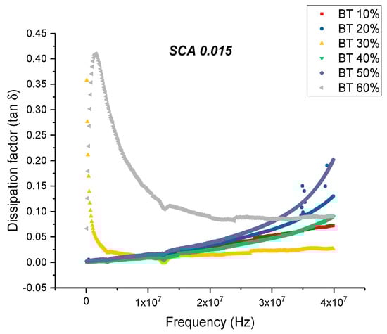 This is an almost 21% decrease in dissipation compared to the maximum value exhibited by the composites prepared using SCA 0.01. The decrease in dissipation factor, as previously mentioned, could be attributed to better interfacial bonding between the BaTiO3 nanoparticles and the epoxy matrix because the coupling agent acts as a molecular bridge between the two, and therefore, contributes to lower conduction losses [80,81].