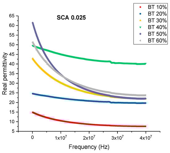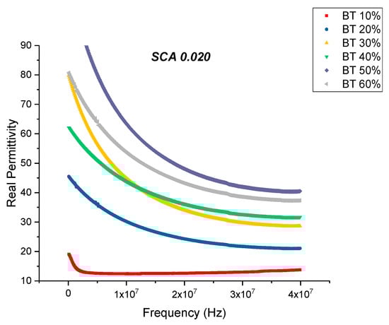 The permittivity of the 0.01 surface treated samples also show an increase in value with increasing volume fraction of BaTiO3 as shown in Figure 6. The maximum value of real permittivity at 20 MHz was recorded to be 32.80 at 60% volume fraction of BaTiO3. This is approximately 14.28% increase compared to the untreated samples. It was also found that at even high concentrations of BaTiO3 the composite did not crack or delaminate due to the improved dispersion, this observation has been made by several researchers [13,21,24,47,50,77]. With the addition of the coupling agent, a more homogeneous and uniform dispersion can be obtained. The enhanced dispensability of the nanoparticles can mainly be attributed to the substitution of the hydroxyl groups, which has a dual effect, (i) lowering interfacial tension between the separated phases and (ii) preventing coalescence of the nanoparticles during processing [47].
