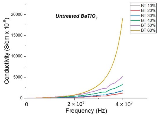 The conductivity of the BaTiO3-epoxy composite that were BaTiO3 nanoparticles which were not surface treated (pristine) is plotted as a function of frequency. The maximum value of conductivity at 20 MHz is 7.84 × 10−4 S/m and occurs at BT 0.6.