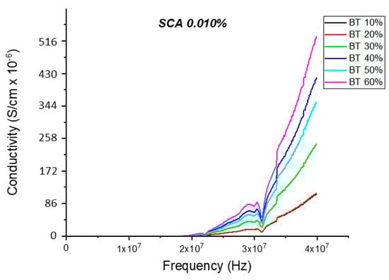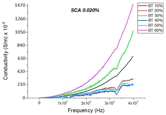 The conductivity of the BaTiO3-epoxy composite that were fabricated using BaTiO3 nanoparticles which were surface modified using 0.010 SCA is plotted as a function of frequency. The maximum value of conductivity at 20 MHz is 4.63 × 10−4 S/m and occurs at BT 0.6.