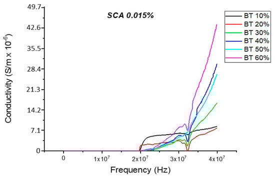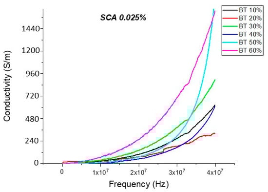 The conductivity measurements, as expected, showed a similar trend to that of the resistivity observations as shown in Figure 19, Figure 20, Figure 21, Figure 22 and Figure 23. For the composites prepared with 0.5 volume fraction of BaTiO3 and surface modified using SCA 0.015, SCA 0.0 and SCA 0.025 the conductivity values were 2.61 × 10−4 S/m, 7.02 × 10−5 S/m and 7.3 × 10−5 S/m, respectively.