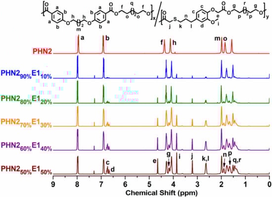 The high yields of products indicate the high reactivity and purity of these monomers. Nipagin and eugenol-derived units’ ratios in the final products of PHN21−xE2x series matched very well with the feed ratios, indicating the excellent compatibility of the system during the whole polymerization process. However, for PHN21−xE1x series, the units’ ratios in the final products gradually deviated from the feed ratios with the increase of eugenol-derived composition. This phenomenon may be ascribed to the high viscosity of the system at an early stage, resulting in the inadequate reaction of E1.