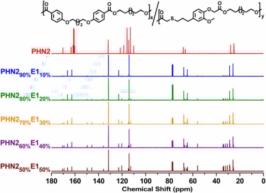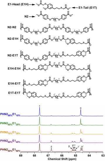 As for PHN21−xE2x series, another situation appeared as shown in Figure 4. Signal δ and γ also displayed single peaks as same as PHN21−xE1x, but the methylene carbons connected to the alcohol-oxygen atoms split into only two groups of peaks (α vs. α’ and β vs. β’) between 64–66 ppm. The reason for this was due to the same magnetic environment of the ester groups in respective N2 and E2 units. In each group, the peak intensities also grow from inequivalence to equivalence with the increase of eugenol-derived composition.