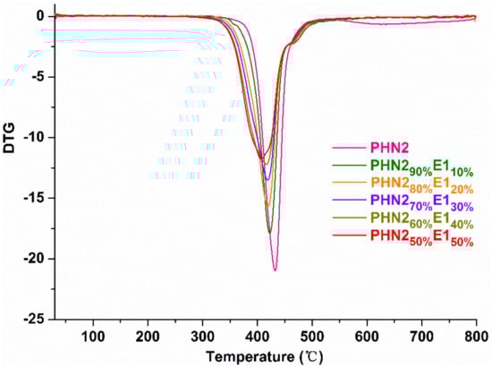 TGA derivative curves of PHN21−xE1x recorded from 25–800 °C at a heating rate of 10 °C min−1 under a nitrogen atmosphere.