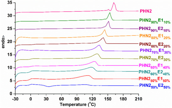 The second heating DSC curves for PHN21−xE1x and PHN21−xE2x after precipitating from methanol carried out from −30 to 210 °C at a heating/cooling rate of 10 °C min−1.