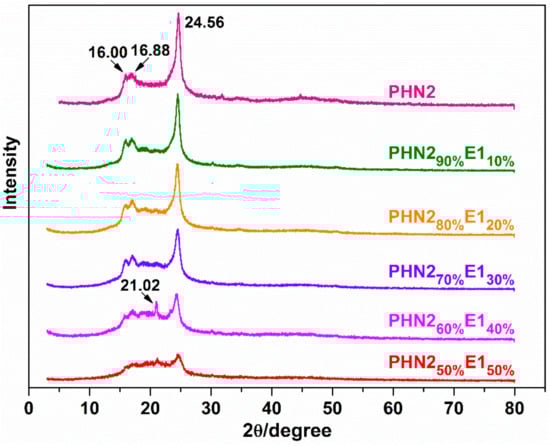 Powder wide-angle X-ray diffraction analysis (WXRD) was carried out to supplement the DSC results. The WXRD curves are depicted in Figure 8 and Figure S11. From the traces, we observe that the polymer samples can form well discrete diffraction signals with the main peaks at about 24.5° characteristic of semi-crystalline materials. PHN2 homopolyester has a scattering pattern with four distinct reflections at 16.00°, 16.88°, 21.02° and 24.56°, respectively, which exactly correspond to the triclinic crystal structure just like displayed by PBT [50,51]. The diffraction pattern was reserved in the copolyesters, taking both diffraction angles and relative intensities into consideration, thereby suggesting that the crystalline manner of PHN2 could be retained in the copolyester samples. The crystallinity values calculated as the quotient between crystalline area and total area of the diffraction curves were given in Table 3. The crystallinities were found to decrease with the increase of eugenol-derived composition. The samples for WXRD were obtained directly from precipitation in methanol, which resulted in the slow alignment of polymer chains and certain degree of crystallization. Polymer chains became increasingly difficult to array orderly with the gradual increase of asymmetrical eugenol-based units. Consequently, the WXRD curves became increasingly smoother, particularly for the series of PHN21−xE2x. Although, X-ray diffraction analysis can only qualitatively or semi-quantitatively allow the study the crystalline behavior, the consistency of DSC and WXRD results can provide good insight into the thermal and crystalline properties for this kind of polyester materials. The influence factors can be explained from the microscopic view, that is, chemical microstructures.