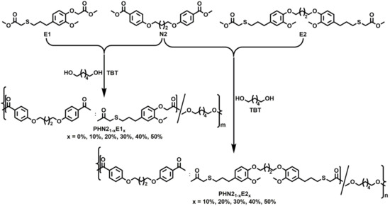 PHN2 homopolyester and PHN21−xE1x, PHN21−xE2x copolyesters were prepared by the melt polycondensation method in the predesigned composition ratios of nipagin and eugenol-derived dimethyl ester monomers with renewable 1,6-hexanediol as a comonomer. The polymerization pathway is illustrated in Scheme 1 and data are collected in Table 1. The symmetrical characteristic of N2 unit resulted in the high crystallizability of copolyesters. When the eugenol-derived components were below and equal 30% in the series of PHN21−xE1x, these samples can’t dissolve in tetrahydrofuran (THF). Meanwhile, the samples for PHN21−xE2x can dissolve in chloroform (CHCl3) only when eugenol-based components were below and equal 20%.