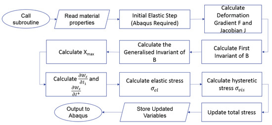 where is a fitting constant which is assumed to increase with filler volume fraction. Figure 1 shows the algorithm developed to implement the model as a user-defined material subroutine (VUMAT) coded in Fortran for Abaqus/Explicit.