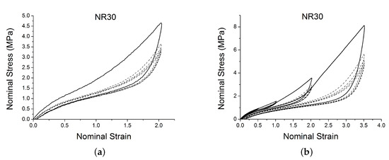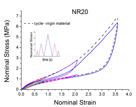 Stress–strain response of natural rubber filled with 20 phr of carbon black (NR20) when subjected to cyclic uniaxial tension. Different behaviour of the material after a different pre-strain is evident.