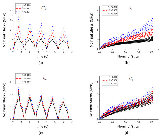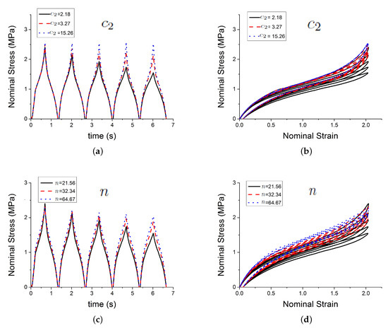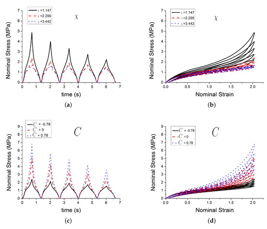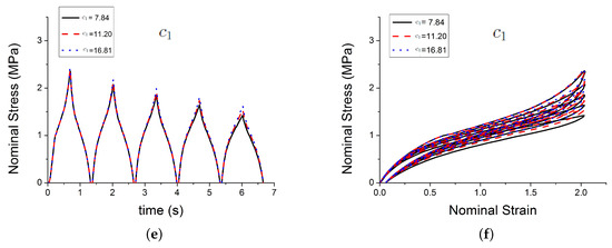 Figure 4 shows the effect of three of those parameters , , on the predicted outputs. Figure 5 shows the effect of parameters , C and . Figure 6 shows the effect of the parameters , n and . Figure 7 shows the effect of the parameter . and , which respectively represent the crosslink modulus and entanglement modulus in the extended tube model, influence the stiffness of the material. The parameter determines the value of before any deformation in the system, and it influences cyclic stress relaxation phenomena. The parameters and C characterise the power law distribution of the amplification factor. They influence the response of the material in the loading paths, modifying the the level of stress and the dissipated energy and defining the level of continuum damage due to cyclic stress softening. n, , and define the relaxation of the maximum amplitude factor to predict the continuum damage, so they operate on the response of the material at a strain higher than 1 and envelop the cyclic stress relaxation process. The constant scales the zero-load relaxation of the material (which is usually very small), and thus determines, together with the stress threshold to overcome before softening starts. The parameter balances elastic stresses (including softening) and viscous effects. The timescale defines the amount of dissipated energy.