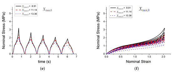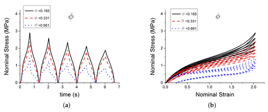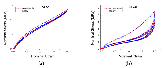 From Equation (6) the hyperelastic stresses can be derived, if and are known. The minimum amplification factor is set to , which corresponds to the assumption that there are non-amplified domains (e.g., without filler) within the material.