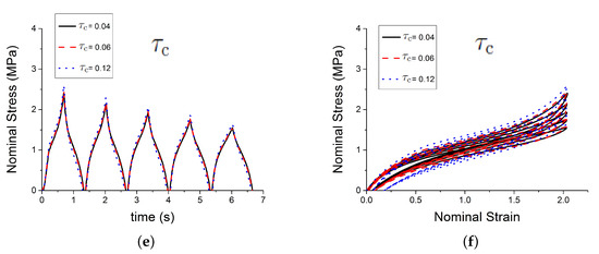 The timescale of zero-load softening given as was put in the exponential for numerical reasons. In practice, it should be sufficiently long that no significant softening happens on the timescale of the simulation, if no load is imposed. This means that for the result of Equation (8) is usually small and the maximum amplification factor stays almost constant. When the model approaches divergence at the second summand inside the exponential increases and induces a decrease of . It shall be noted that a more careful derivation was carried out in [32] which relates and to temperature and allows the modeling of Mullins effect recovery [6] at elevated temperatures.
