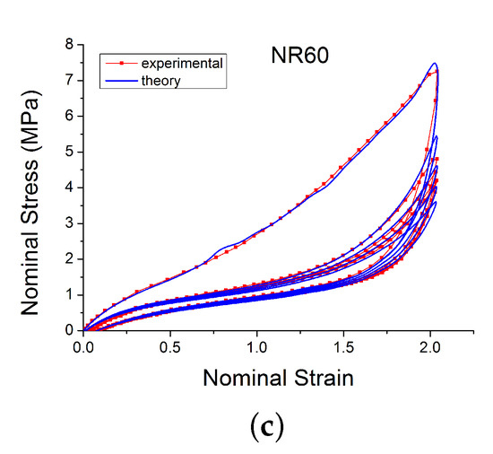 Comparison of the new model with experimental data loaded with cyclic uniaxial test with uniform maximum strain amplitude [14]. Subfigures (a–c) show respectively the behaviour for NR2, NR40 and NR60.