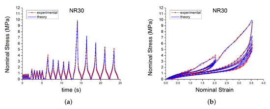 Comparison of the new model with experimental data for NR30 loaded with cyclic uniaxial stress with different maximum strain amplitude in step up. Subfigure (a) shows the Nominal Stress versus time. Subfigure (b) shows the Nominal Stress versus Nominal Strain.
