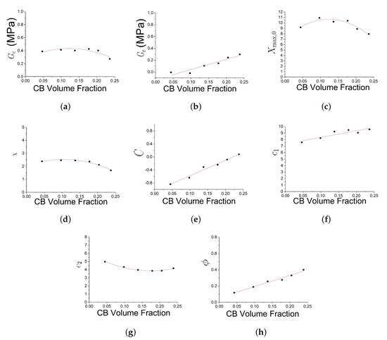 The trend of the parameters with the true Carbon Black (CB) filler volume is presented in Figure 10.