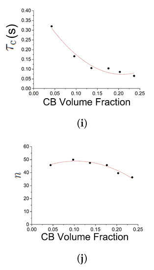 Moreover, it can be seen that the parameters , C, , and show some kind of discontinuity in the range of 9–13 vol. % carbon black loading. This roughly corresponds to the percolation threshold of the filler network inside the polymer matrix [37].